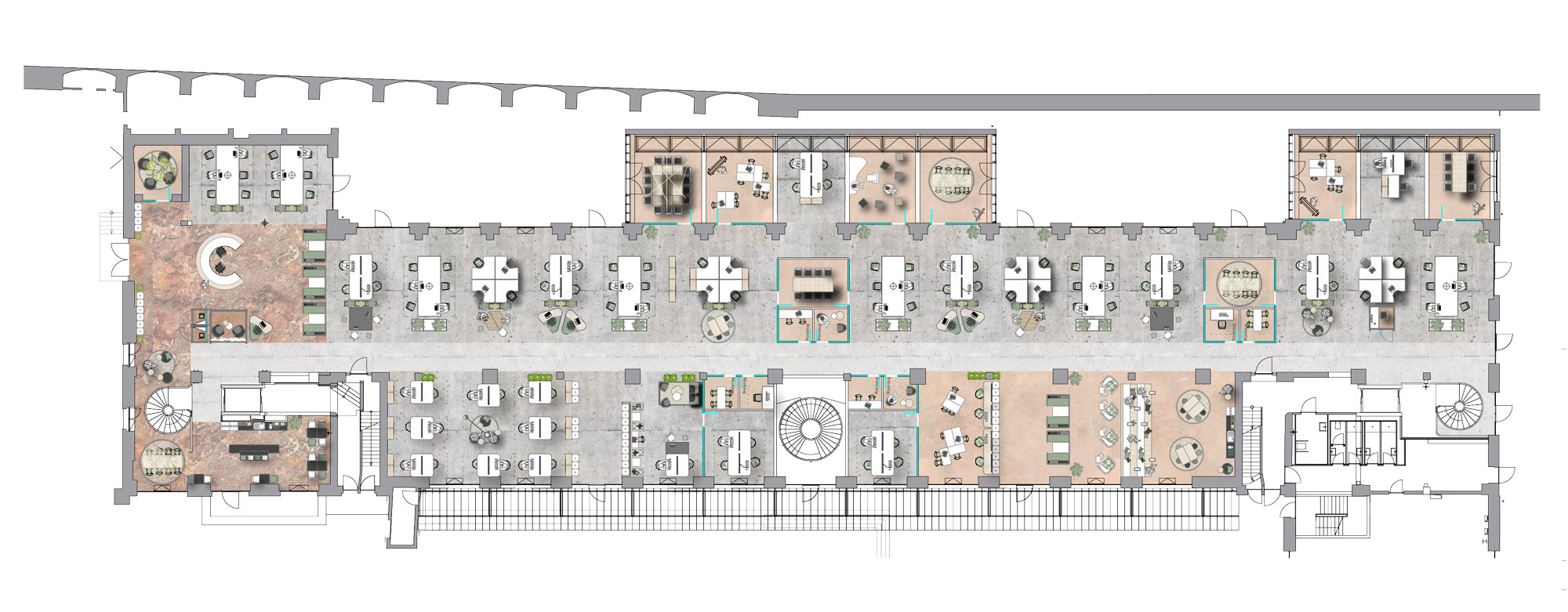 The ground floor of the Abgangspackkammer impressively combines historic architecture with the demands of modern work environments. Iconic arched windows, expansive windows, and impressive ceiling heights create an atmosphere of spaciousness, light, and openness—a place that inspires and fosters a sense of identity.
