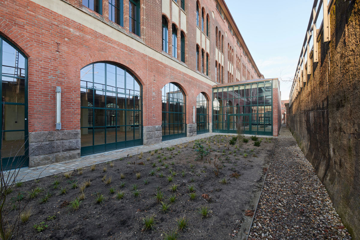 Sheltered by the surrounding buildings, a space with a unique atmosphere has been created, complete with a rooftop garden for moments of relaxation.