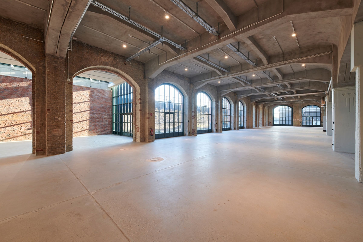 The ground floor of the Abgangspackkammer impressively combines historic architecture with the demands of modern work environments. Iconic arched windows, expansive windows, and impressive ceiling heights create an atmosphere of spaciousness, light, and openness—a place that inspires and fosters a sense of identity.